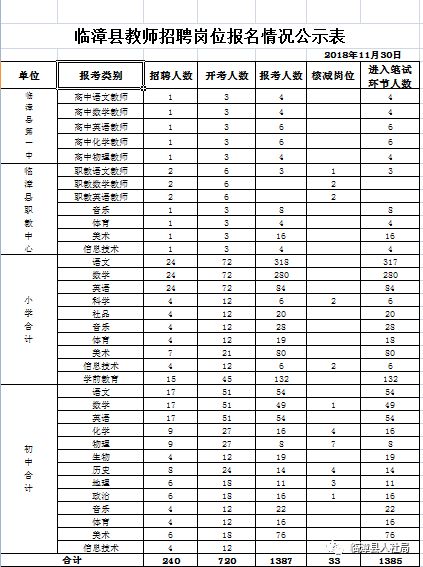 按照《临漳县2018年公开招聘教师实施方案》程序要求,我县公开招聘教师报名、资格审查工作已结束。现将有关情况和相关事宜公示如下:
