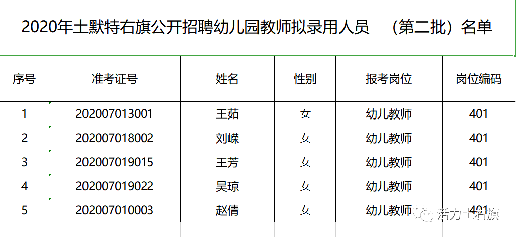 根据《2020年土默特右旗公开招聘幼儿园教师简章》安排,经报名、资格初审、笔试、资格复审、面试、体检和考核等程序,进入拟录用人员名单公示环节。现将拟录用人员(第二批)(名单附后)进行公示。